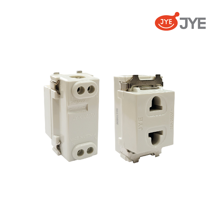 - Ổ cắm đơn 2 chấu không màn che JY-K1001SV phù hợp với nhiều loại phích cắm, đưa nguồn điện chính sang thiết bị kết nối cùng một cách nhanh chóng.